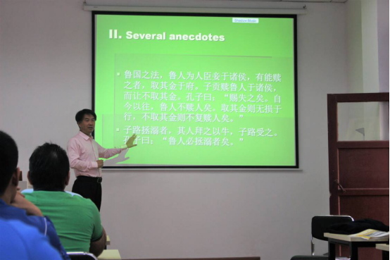 当谈到孔子《论语》思想时,全场气氛逐渐开始活跃起来。朱宾忠教授利用Several Anecdotes来进行趣味化的讲解,谈孔子善于取法他人,曾说:“三人行,必有我师焉。择其善者而从之,其不善者而改之。”学无常师,好学不厌,乡人也赞他“博学”。 与此之外,鲁国之法,鲁人为人臣妾于诸侯,有能赎之者,取其金于府。子贡赎人于诸侯,而让不取金。子曰:“赐失之矣,自今以往,鲁人不赎人矣,取其金则无损于行,不取其金则不复赎人矣。”