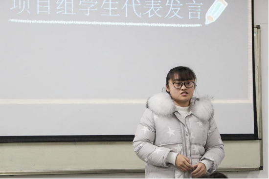 接着由吴瑶和王朔代表项目组学生发言,她们提到了完成项目时遇到的问题和解决的办法,谈到了自己的收获与不足,相信项目组的所有成员都有所收获、有所提高。最后王朔同学以“不忘初心,砥砺前行”的祝语结束发言。