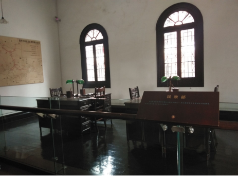 纪念馆的正厅是武昌起义后成立的中华民国军政府湖北都督府,在这里我们看到了当时军政府的各个机构,如民政部、军令部、军务部、鄂军都督府会议厅、外交部等各个部门。看到各办公室干净整齐的办公桌椅时,我们不难想象革命军认真办公的情形,他们为了人民兢兢业业的工作着,作为后代的我们不能不为之动容。
