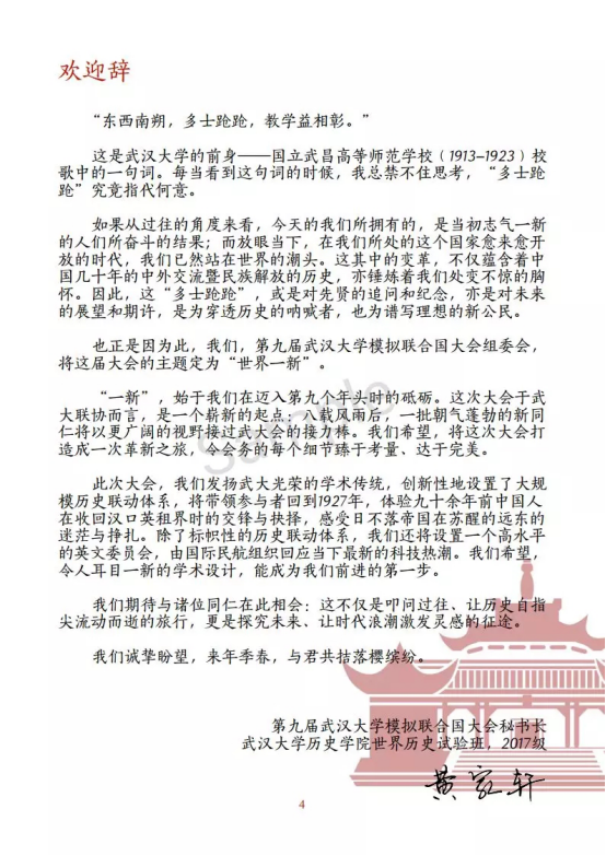第九届武汉大学模拟联合大会将于2019年4月19日开幕,我校英语专业17级朱晴将带队18级模联新成员赴武大参会,希望他们在本次武大之行中能够有所收获,进一步感受模联的魅力,提高自己的综合能力,培养自己的国际视野。