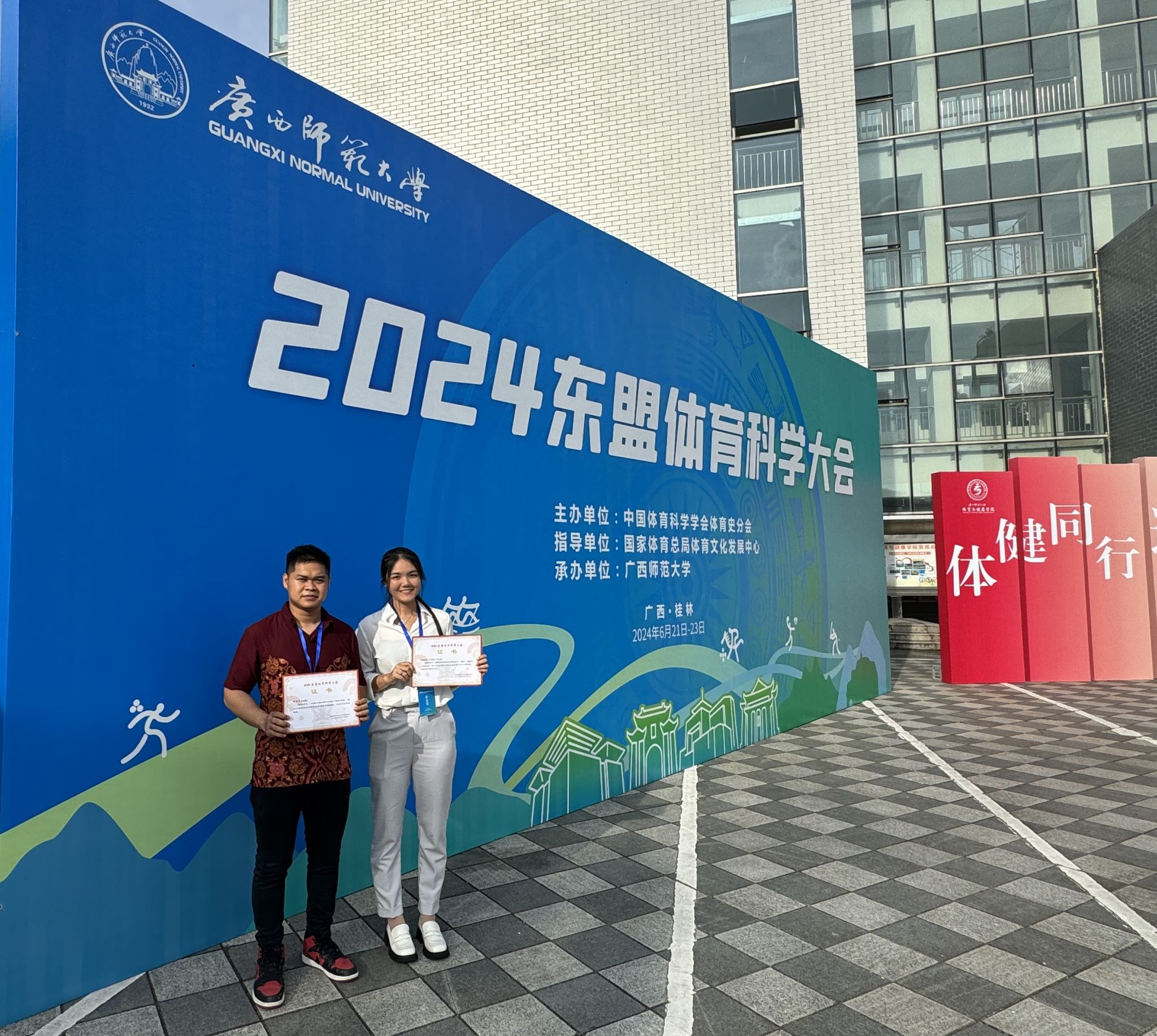 6月21日至23日,由中国体育科学学会体育史分会主办,国家体育总局体育文化发展中心指导,广西师范大学承办的2024东盟体育科学大会在广西桂林举行。我校2名留学生的投稿入选专题报告并进行了现场汇报。